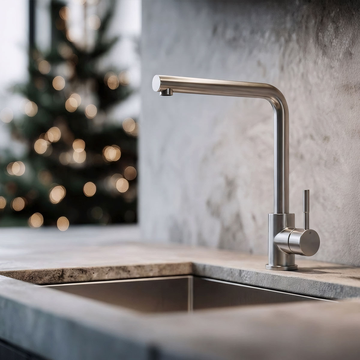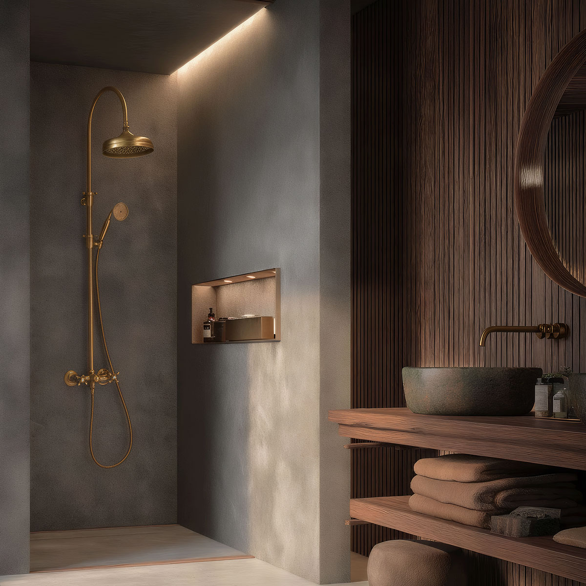 Wnętrza zimą mają swój własny rytm. Domy zaczynają świecić od środka, gdy światło staje się łagodniejsze, a powietrze spowalnia. W okresie świątecznym, ciepło, introspekcja i dbałość o szczegóły stają się luksusem, a nie obfitością.Łazienka, która często jest pomijana podczas świątecznego stylizowania, jest jednym z najbardziej wyrafinowanych sposobów na dodanie subtelnej luksusowości do domu. Całą atmosferę można zmienić, wybierając odpowiednie elementy wyposażenia, zwłaszcza te o złotych i brązowych wykończeniach. Przekształcają one utylitarną przestrzeń w spokojne miejsce, które jest zarówno świąteczne, jak i klasyczne.Te metale nie domagają się uwagi. Nawet minimalistyczne łazienki zyskują poczucie spokojnej wspaniałości dzięki ich blaskowi, który łapie delikatne zimowe światło i równoważy chłodne tony kamienia i kafelków.